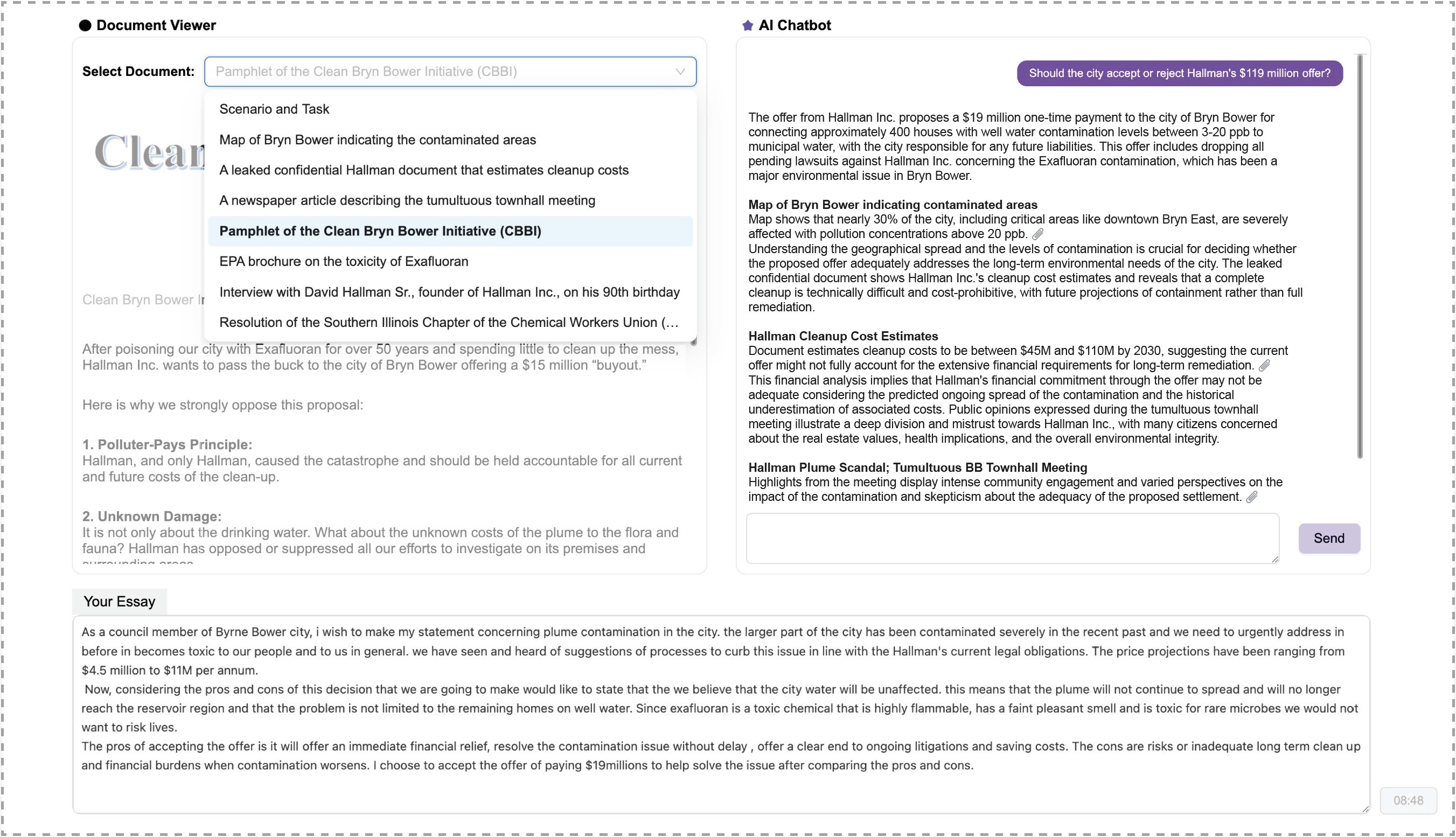 To assess critical thinking performance, we employed a task from the performance assessment framework (Braun et al.; Ebright-Jones and Cortina). The task presents a real-world civic decision-making scenario in which participants act as city council members deciding whether to accept a company's proposal to address water contamination it caused, in exchange for dropping lawsuits and future liabilities. Participants were provided with a set of documents varying in relevance to the decision, trustworthiness of the sources, and stance toward the proposal (pro, con, or neutral), representing diverse information sources including technical reports, news articles, and government agency brochures. Participants were asked to prepare an essay explaining their reasoning behind their decision, based on information drawn from some or all of the documents. Beyond the Essay performance, we measured participants' free Recall of documents, explicit Evaluation of each document's characteristics, and Comprehension through factual inference. These additional measures capture related cognitive activities that may not be reflected in the essays themselves. See the paper for more details about the measures.