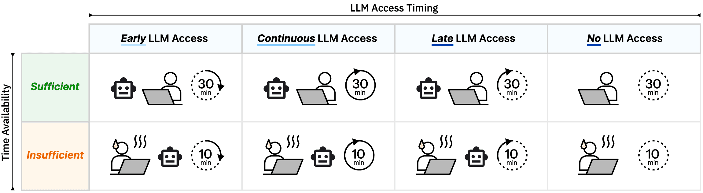 Within the dimension of access timing, comparing "using an LLM" versus "not using one" is effectively comparing continuous LLM access against no access at all. Early LLM access — where the LLM is only available at the beginning of a task — may be particularly beneficial, serving as initial scaffolding that handles groundwork and potentially frees up cognitive resources for deeper deliberation (Imundo et al.; Singh et al.). Late LLM access — where the LLM is only available near the end of a task — may also prove beneficial. Prior studies on other cognitive tasks, such as math problem solving (Kumar et al.) and creative writing (Qin et al.), have shown that providing LLM access after participants' independent attempts improved their performance. The second type of time constraint is time availability. Time pressure is a pervasive reality in our daily life and work, and it can shift people from deliberative reasoning to heuristic processing (Gonthier; Karau and Kelly; Kocher and Sutter).