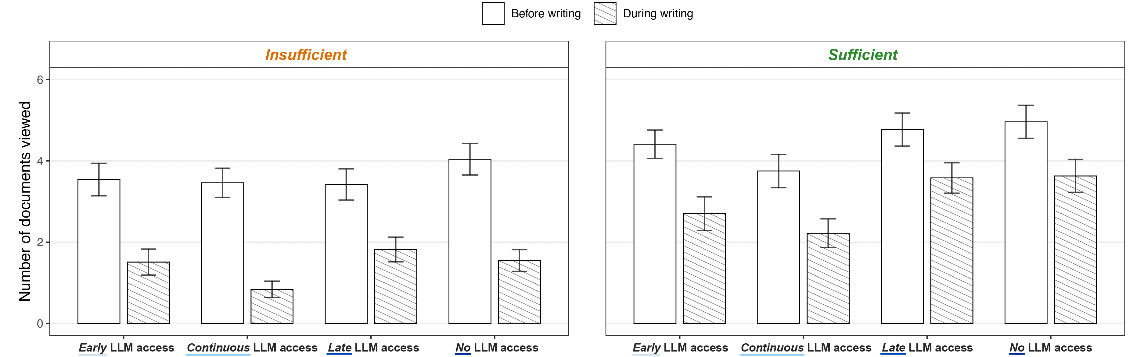 How did participants engage with source documents before and during writing? We found that participants having Early and Continuous LLM access viewed fewer documents during writing, particularly under Sufficient time. This suggests less iterative consultation of the sources and greater anchoring to LLM-provided initial framing, rather than further deliberation.