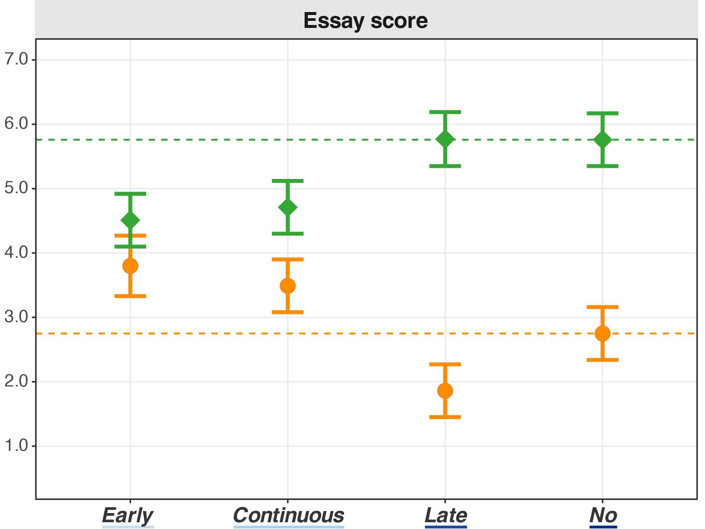 The number of valid arguments, as the primary component of the Essay score, showed a similar trend. Specifically, under Sufficient time, Late and No LLM access showed similar argument quantity.