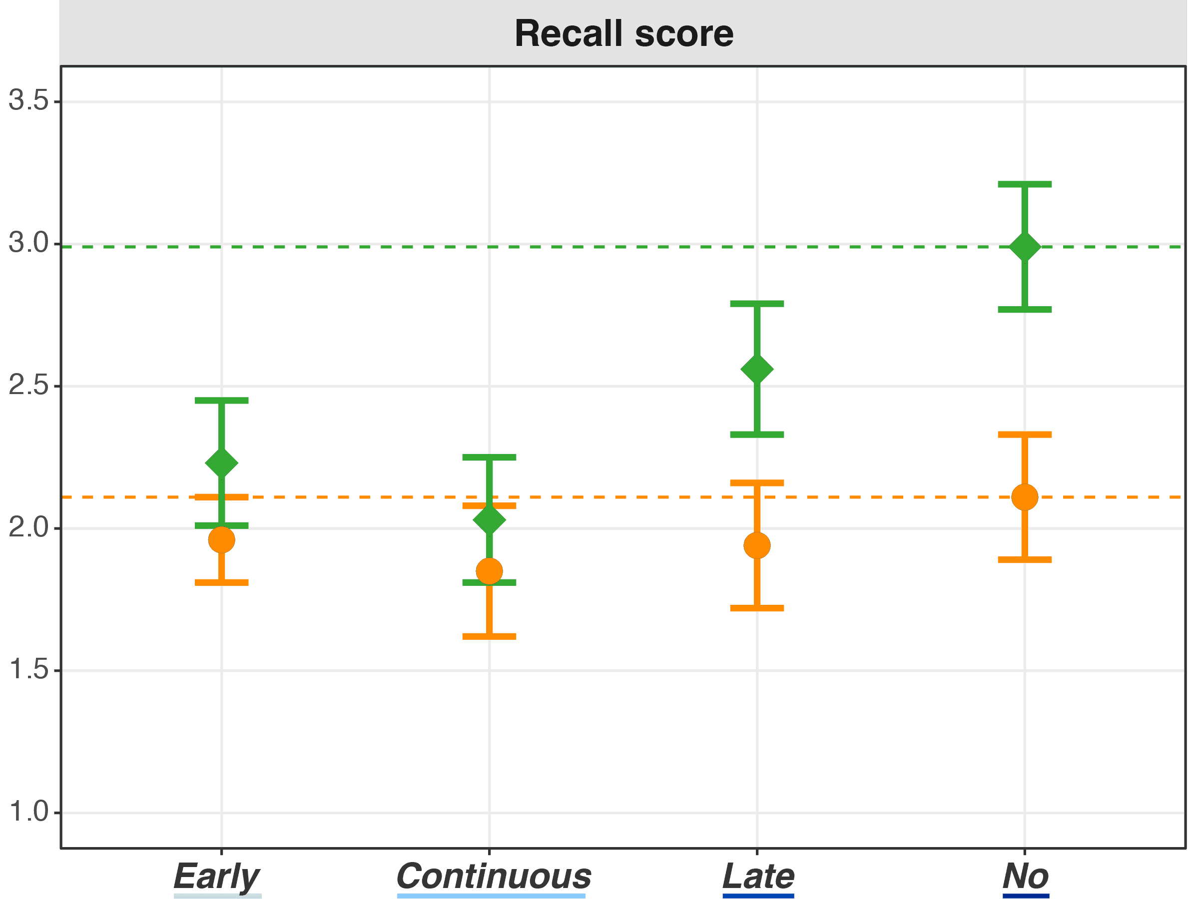 Under Insufficient time, all LLM access timings showed similarly poor Recall. Under Sufficient time, having LLM access from the start (Early, Continuous LLM access) impaired Recall compared to working independently first (Late, No LLM access).