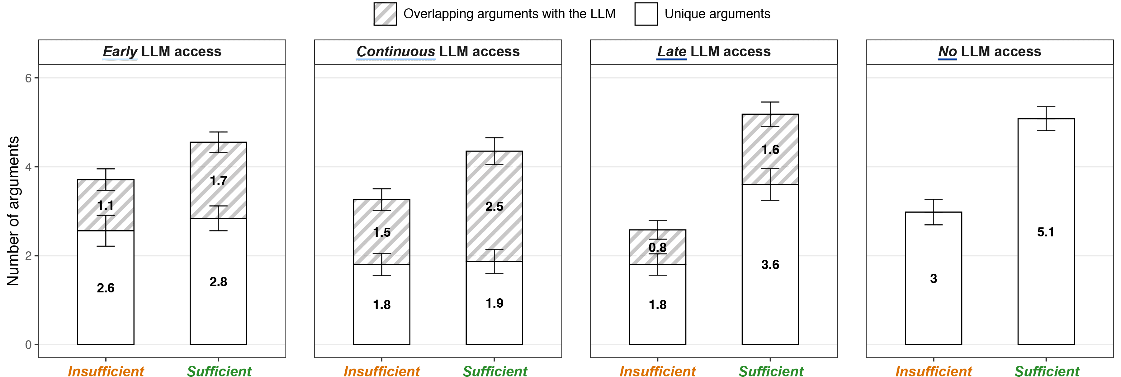 Did participants simply follow the LLM’s arguments? By examining the overlap between arguments in each participant's essay and the LLM responses they received, we found that participants having Early and Continuous LLM access showed minimal increases in non-overlapping arguments from Insufficient to Sufficient time, while those having Late and No LLM access showed substantial increases. This suggests that having LLM access from the start may limit further deliberation, even when more task time is provided.